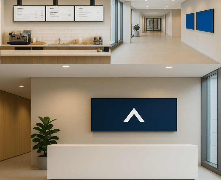 Implementamos monitores de alta definición y pantallas profesionales en recepciones, halls o cafeterías, ideales para mostrar información interna, mensajes corporativos, noticias o el menú del día de forma dinámica y atractiva.